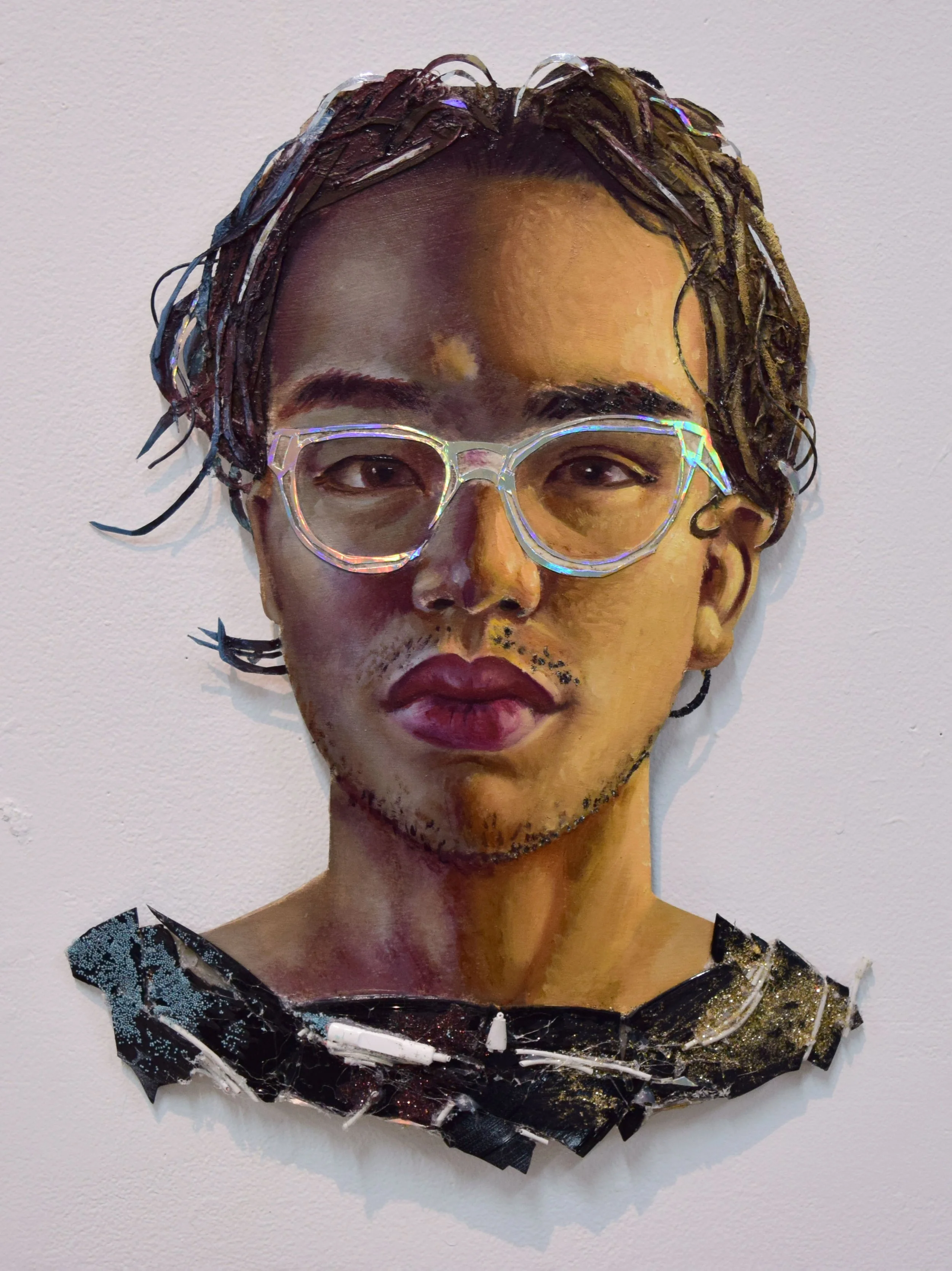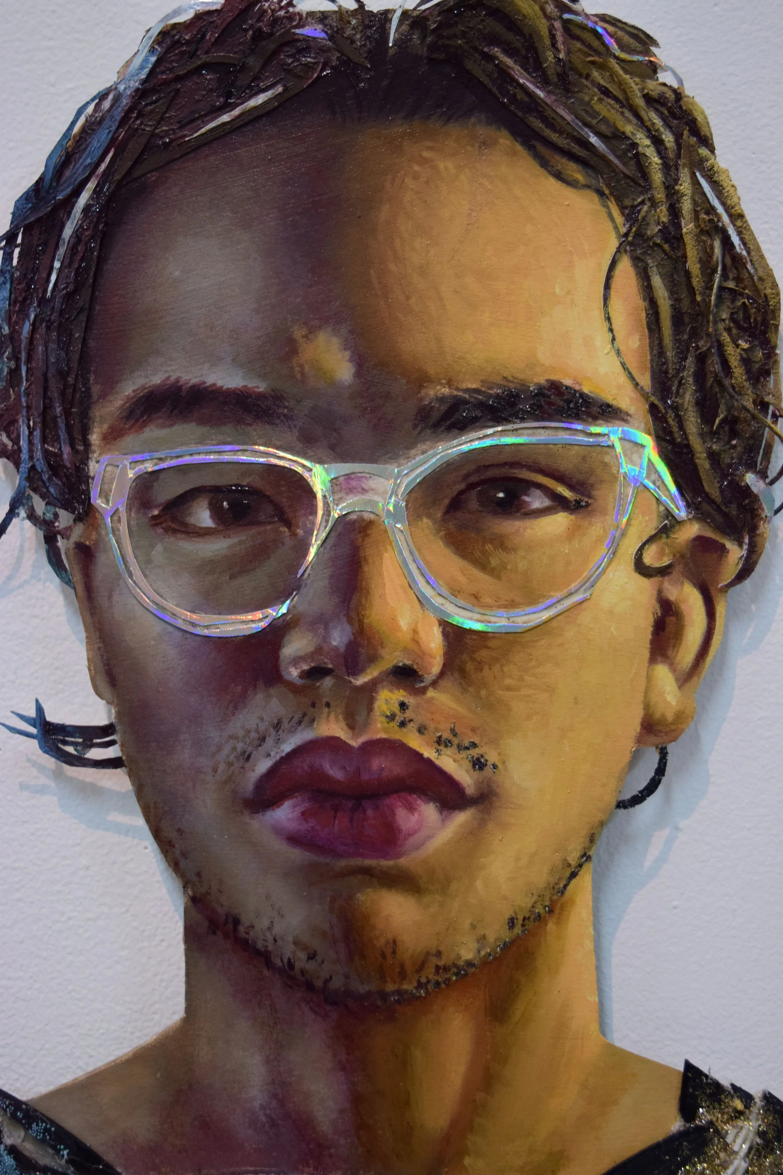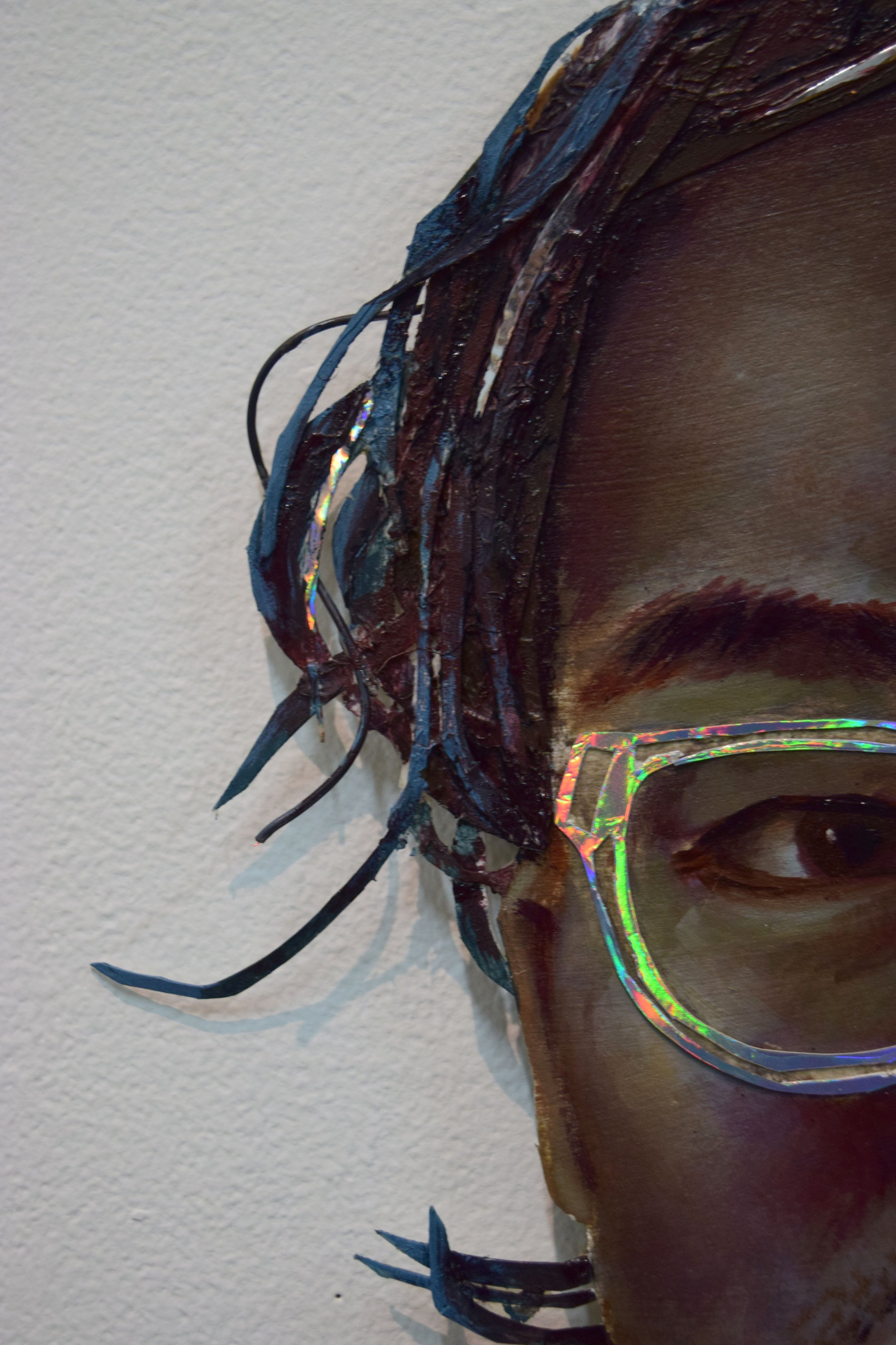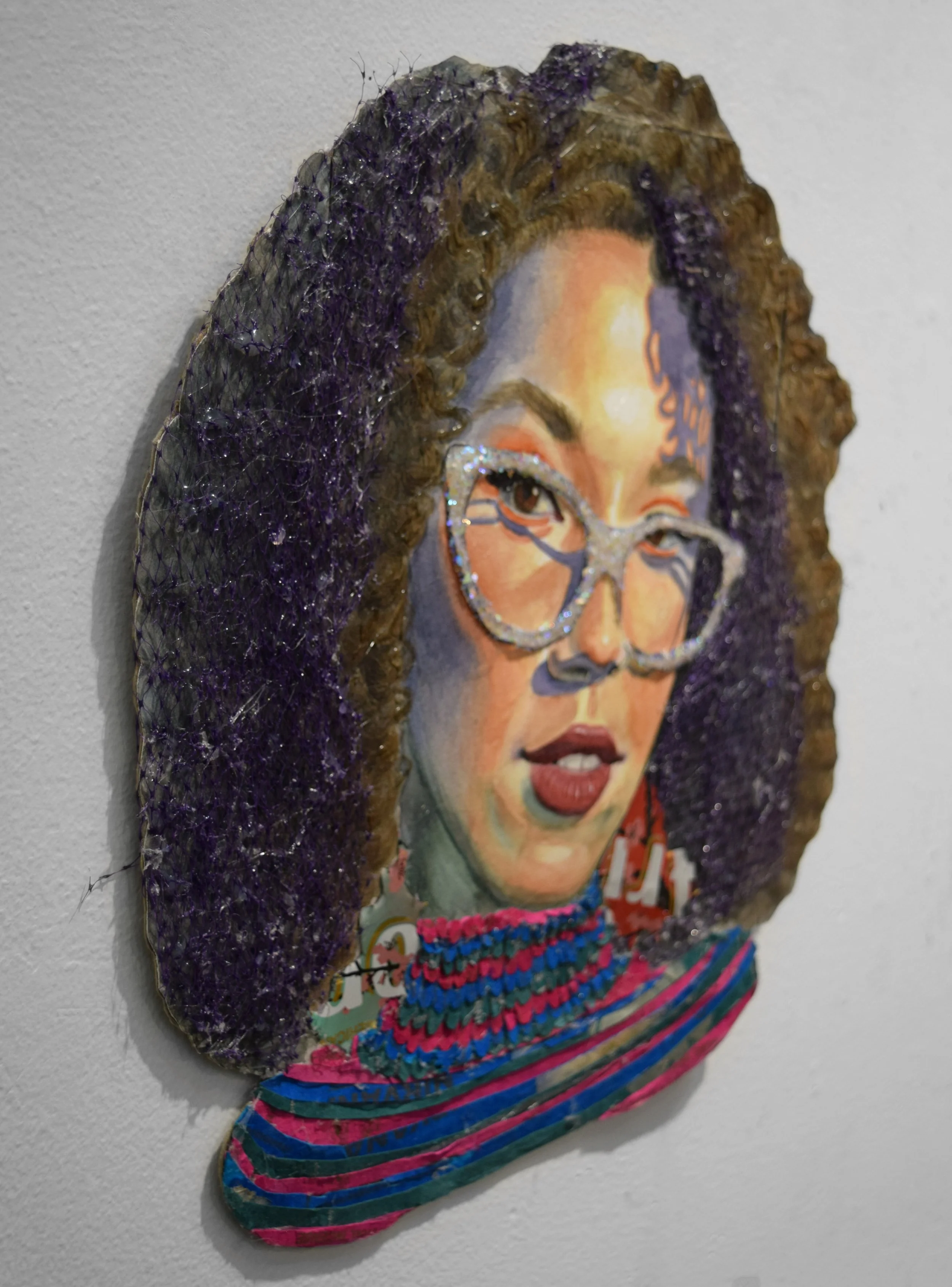 Made with oil paint, paper, glitter, records, headphones, chipboard, wood glue, and mirrored paper. 14.25 x 10.25”. 2025.