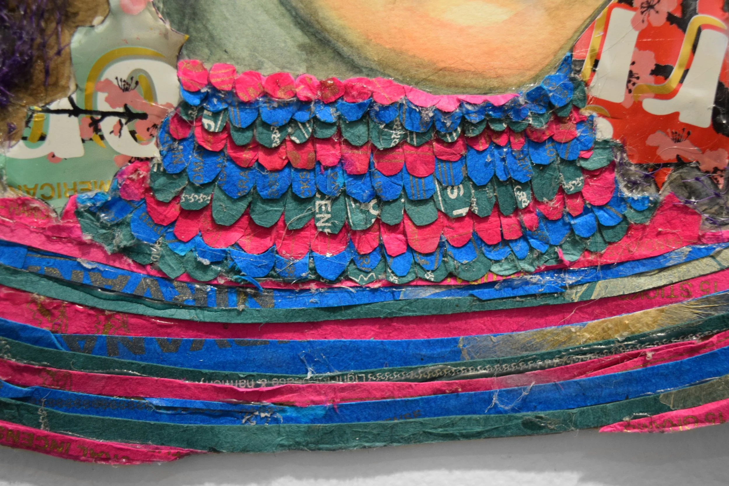 Made with soft pastel, Canson mixed media paper, chipboard, paper towels, Pokémon cards, plastic spoons, and an aluminum tray. 16x10.5". 2022.